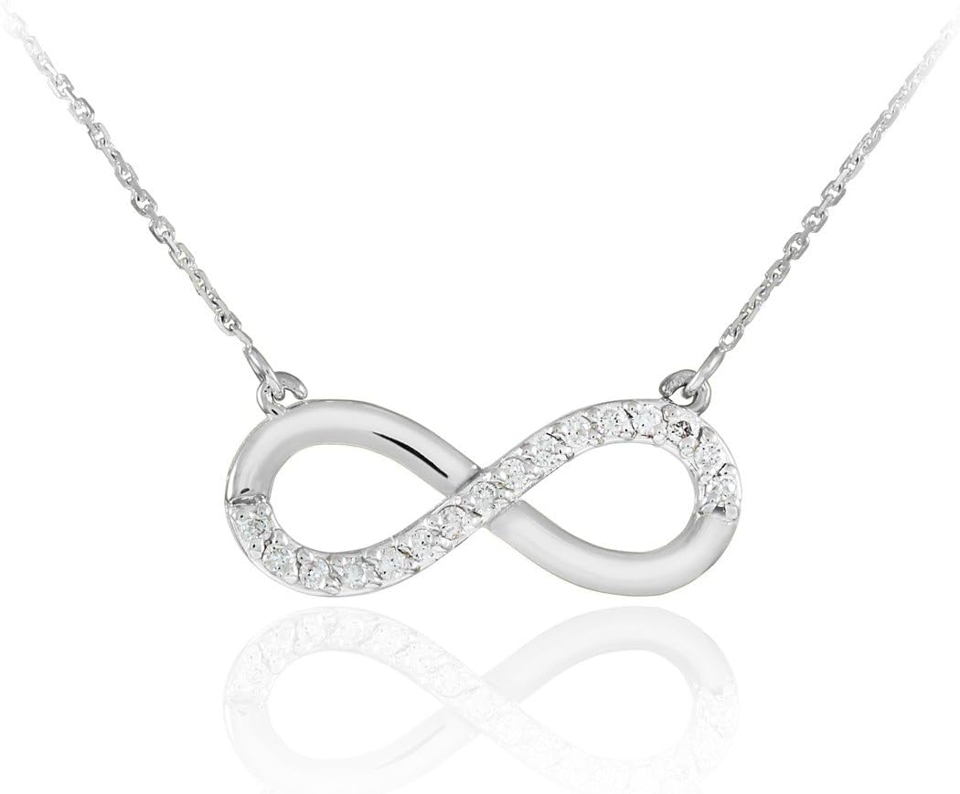 This 14K white gold infinity symbol pendant necklace features 16 round white diamonds totaling 1/8 carat, set in a prong setting. The 0.8 by 0.3 inch pendant hangs on a rolo chain with a spring ring clasp, available in various lengths for a perfect fit.