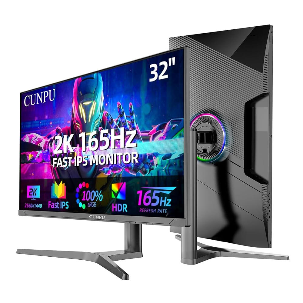 The 32 Inch Gaming Monitor by CUNPU features a QHD 2560 x 1440 resolution with a 2K IPS panel, 165Hz refresh rate, and 1ms GTG for smooth, vibrant visuals. It offers 100% sRGB, FreeSync, HDR10, and ergonomic height, tilt, swivel, and pivot adjustments. VESA mountable with DisplayPort and HDMI connectivity.