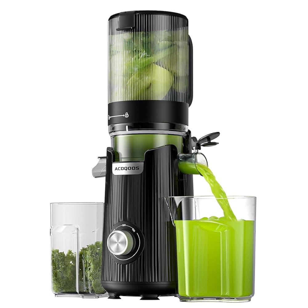 The ACOQOOS Cold Press Juicer features a 5.3 inch wide feeding chute for whole fruits and vegetables, a 1.8 liter capacity, and easy-to-clean design. Includes two cups for convenience. Ideal for efficient, healthy juicing at home.