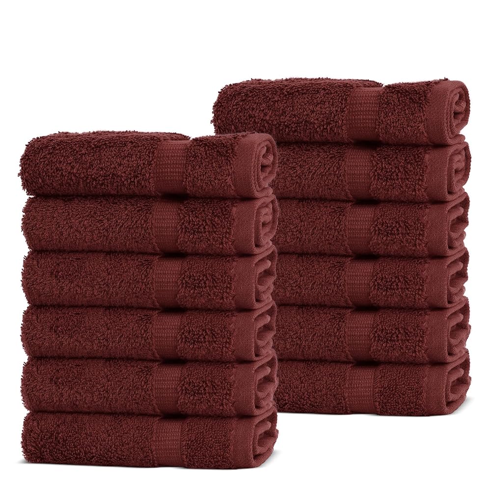 Chakir Turkish Linens offers a 12-piece set of premium washcloths made from 100% cotton, designed for hotel and spa quality. These cranberry-colored, soft, and absorbent towels feature a durable bordered style, are machine washable, and come bagged for convenience.