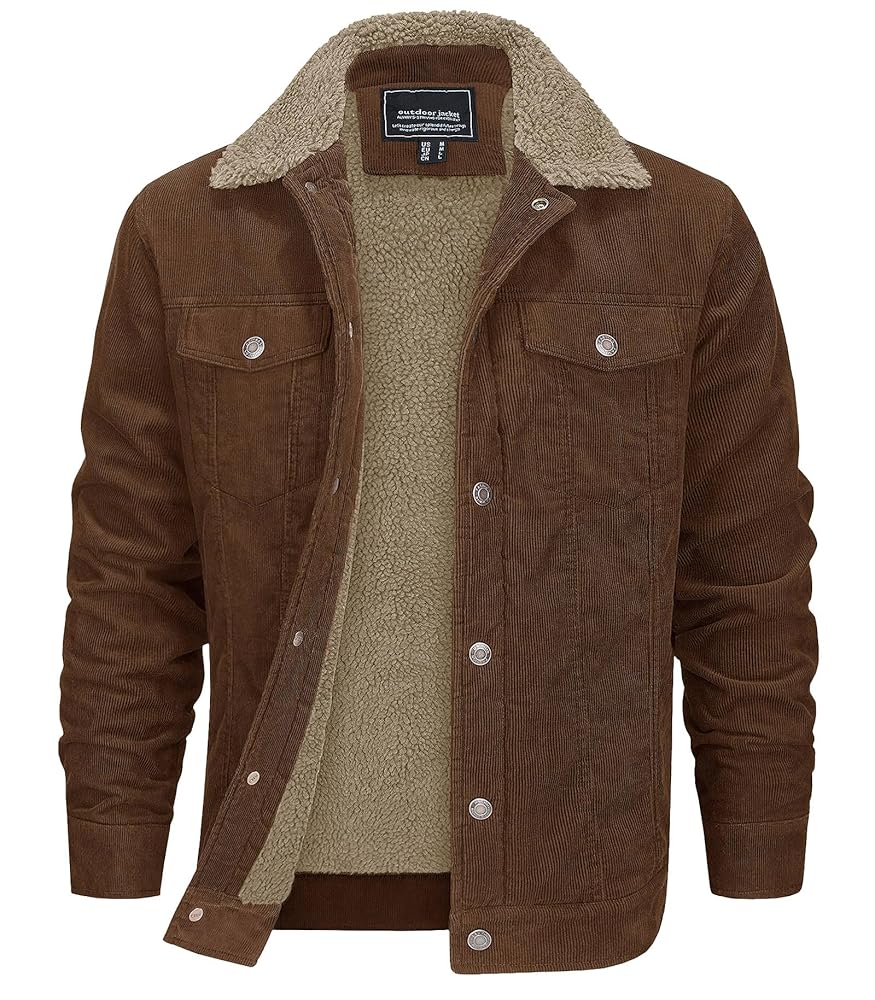 - Features: The sherpa jacket is in solid color. It has a comfy fit and a snap button front closure. The fashion turn-down collar design is very nice. The unique corduroy material creates a classic and stylish vintage style and it can be matched with various kinds of clothing