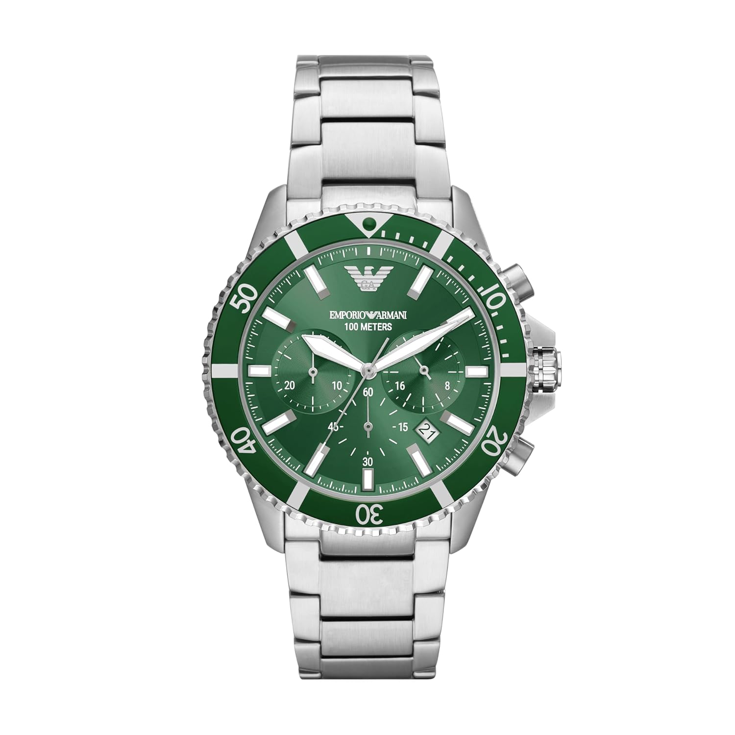 The Emporio Armani Men’s Chronograph Stainless Steel Watch AR11500 features a 43mm round stainless steel case, green dial with mineral glass, and a silver stainless steel band. It offers quartz movement, chronograph function, water resistance up to 100 meters, and a deployment clasp for secure wear.