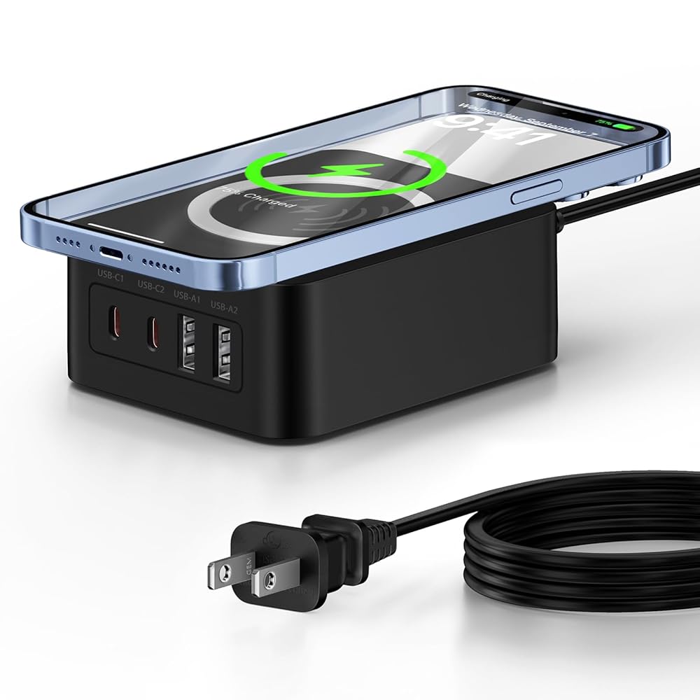 - 【What You Get】:1PCS 4-Port USB c charging station power strip with wireless charging pad,1PCS 4FT extension cable, our worry-free 12-month w arranty, and friendly customer service. If you have any questions or concerns, please feel free to contact us.