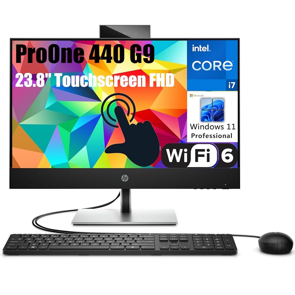 The HP Pro One 440 G9 is a 23.8-inch FHD touchscreen all-in-one desktop designed for business use. It features a 12th Gen Intel i7-12700 processor with 12 cores, 16 GB DDR4 RAM, 1 TB PCIe SSD, Intel UHD 770 graphics, Wi-Fi 6, Bluetooth 5.3, and runs on Windows 11 Pro.