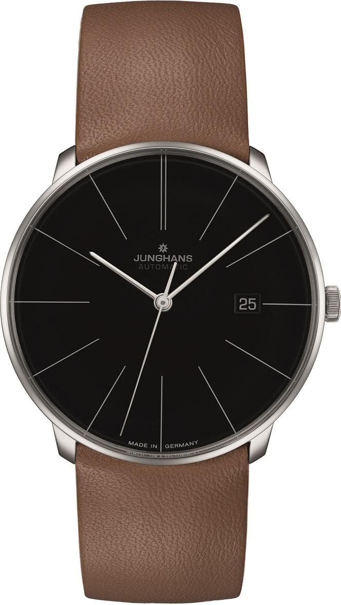 Featuring a Brown Band, Silver-tone Case, Scratch Resistant Sapphire Crystal The JUNGHANS Meister Fein features a black sunray dial and sapphire crystal, combining elegance with durability. This automatic watch from the Undercover Sophisticate collection offers refined craftsmanship and a tang buckle clasp, model number 027415400. The JUNGHANS Meister Fein Black Sunray Dial Automatic Watch combines timeless elegance with precision craftsmanship. Featuring a sleek black sunray dial, durable sapphire crystal, and a comfortable tang buckle clasp, this sophisticated timepiece offers reliable automatic movement and refined style for the discerning wearer.