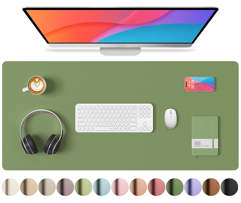 The Leather Desk Pad Protector is a non-slip, waterproof PU leather mat designed for office and home use. It provides a smooth surface for your keyboard and mouse, protecting your desk while enhancing workspace organization with its durable and stylish olive finish.