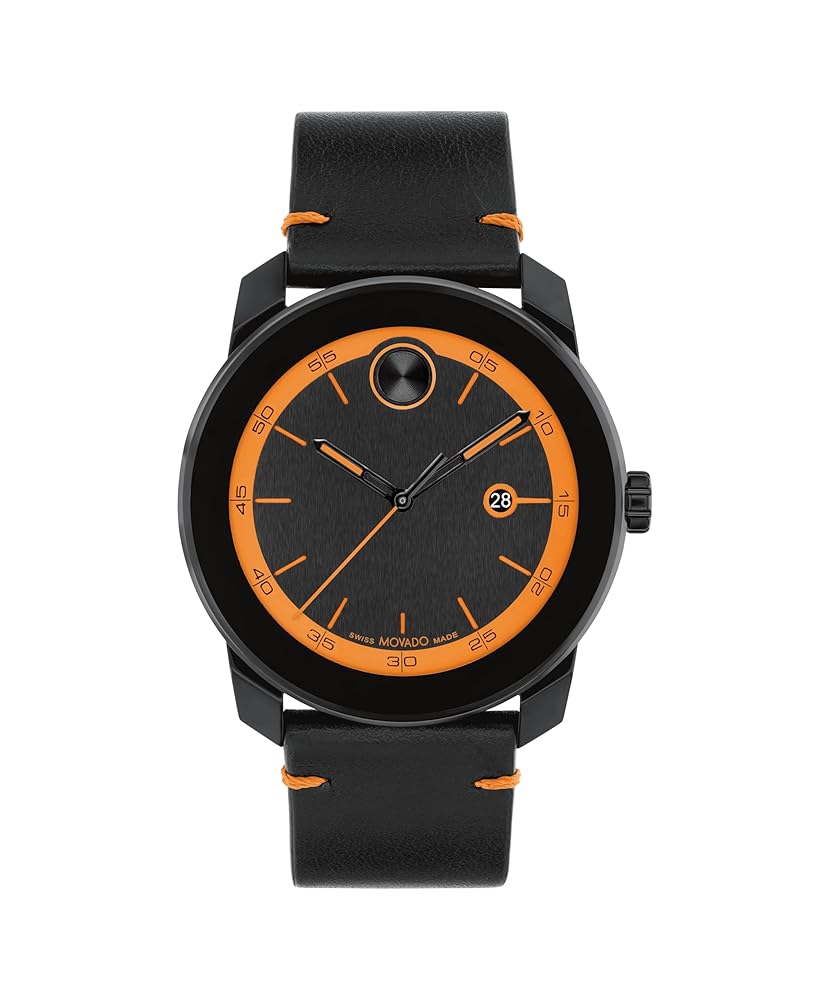 - Ultra-modern design defined by pops of color and sporty style. Go cool and contemporary in this black TR90 timepiece with vibrant orange accents. The 42mm case houses a black dial with black Swiss Super-LumiNova accents and a date window. A luxe black leather strap with orange stitching completes the design.