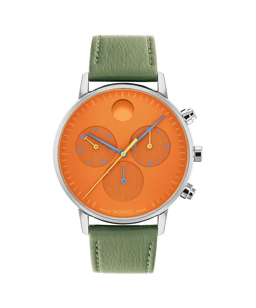 Imported The Movado Face Men’s Watch features a 43mm stainless steel case with a vibrant orange dial and green vegan leather strap. Equipped with Swiss quartz chronograph movement, day-date calendar, and 3 ATM water resistance, this luxury analog timepiece combines style and functionality for the modern man.