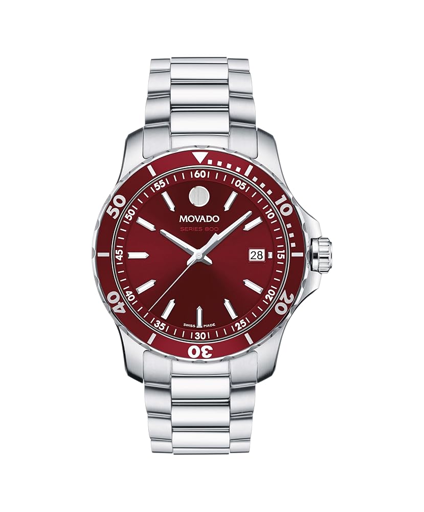 The Movado Series 800 Men’s Sport Watch features a 40mm stainless steel case with a red dial protected by a sapphire crystal. It offers Swiss quartz movement, a stainless steel link bracelet with deployment clasp, date display, and 20 ATM water resistance, combining luxury and diver-inspired design.