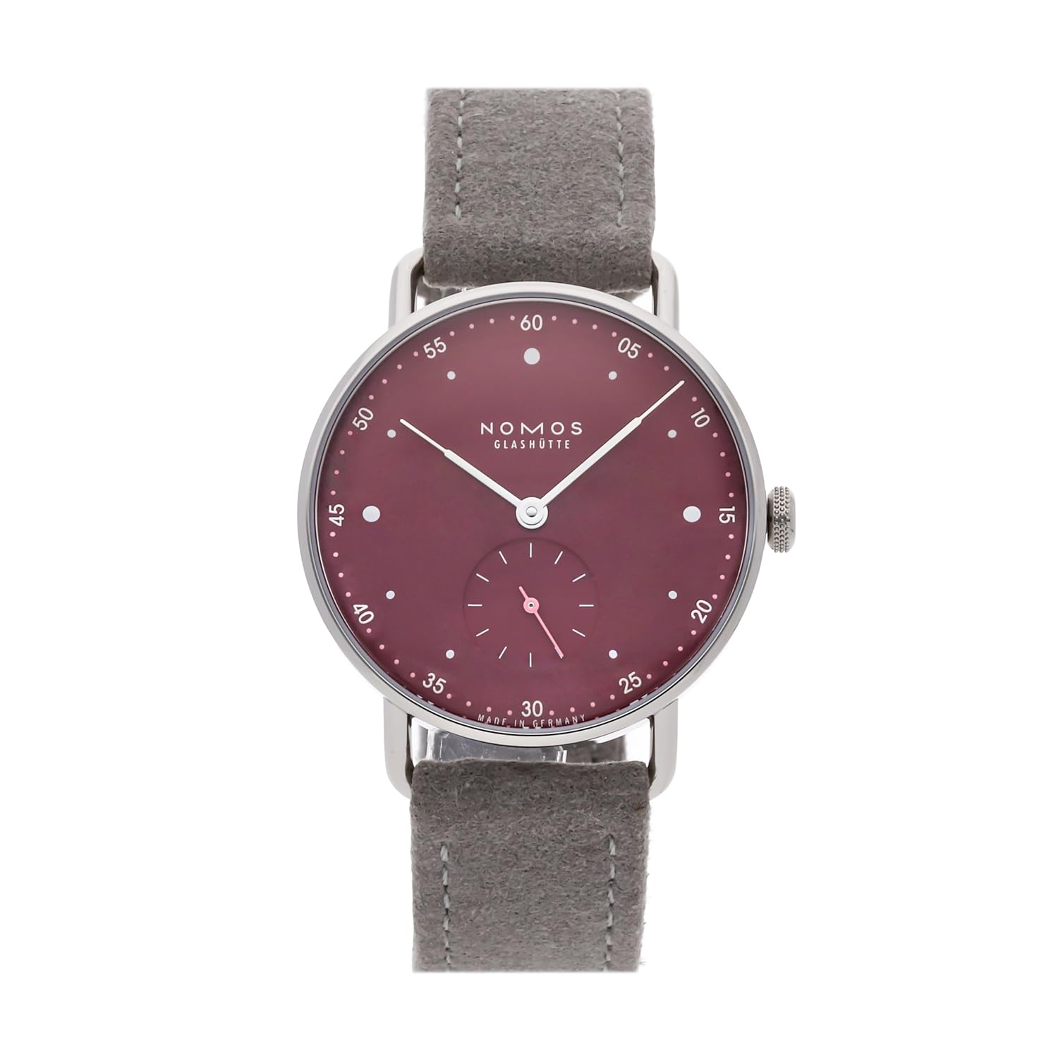 Featuring a Gray Band, Silver-tone Case, Scratch Resistant Sapphire Crystal The Nomos Metro 33 Automatic Muted Red Dial Watch 1123 is a refined timepiece from the Undercover Sophisticate collection. Featuring a tang buckle clasp and a distinctive muted red dial, this model combines elegant design with reliable automatic movement for everyday sophistication.