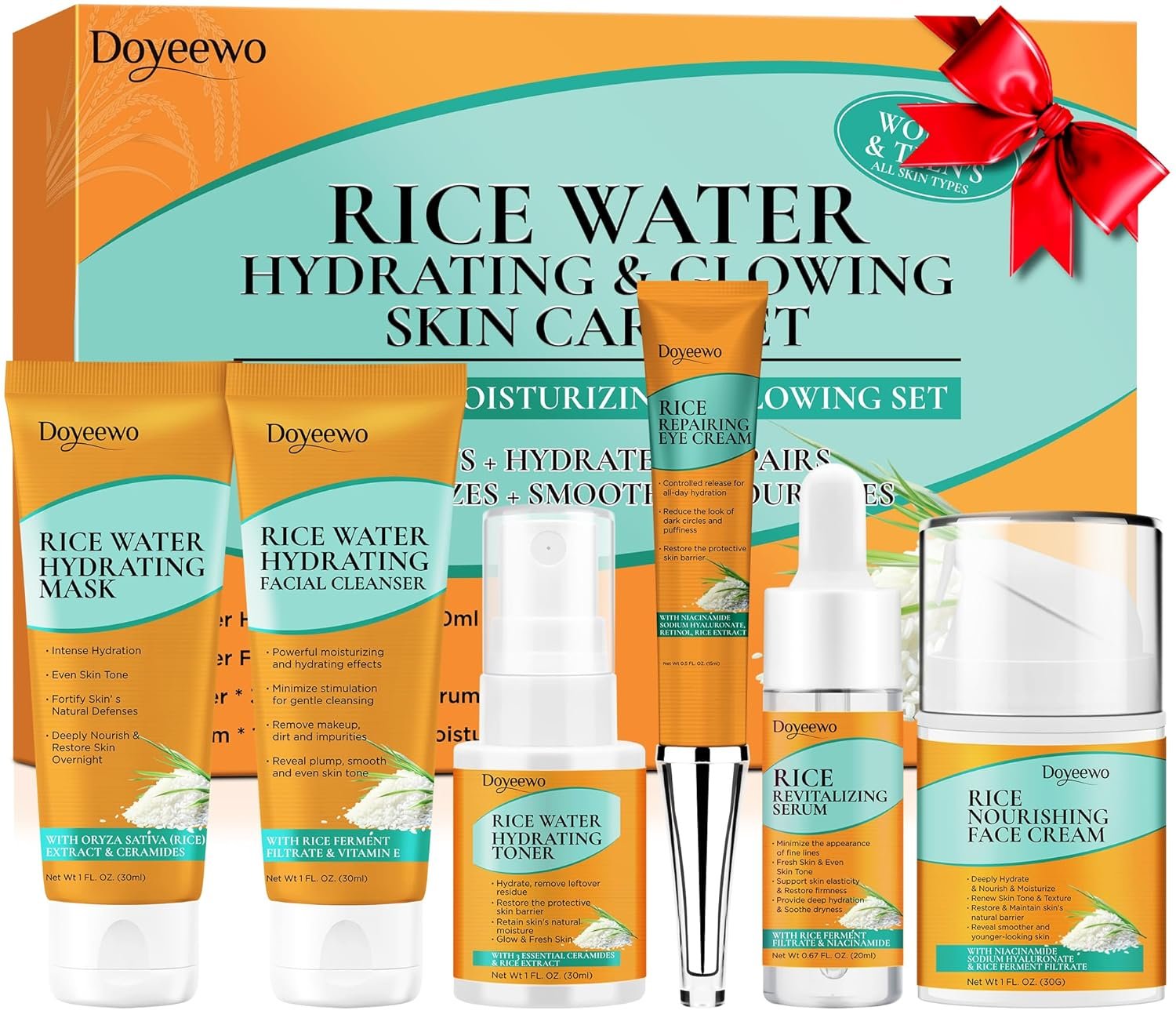 - Complete Rice Water Skin Care Set: Our skincare set is a comprehensive set includes a makeup remover, cleanser,toner,serum,moisturizer and eye cream.It provides everything needed for a full skincare routine,offering controlling oil,hydrating,tightening pores,soothing,glowing and anti-aging benefits
