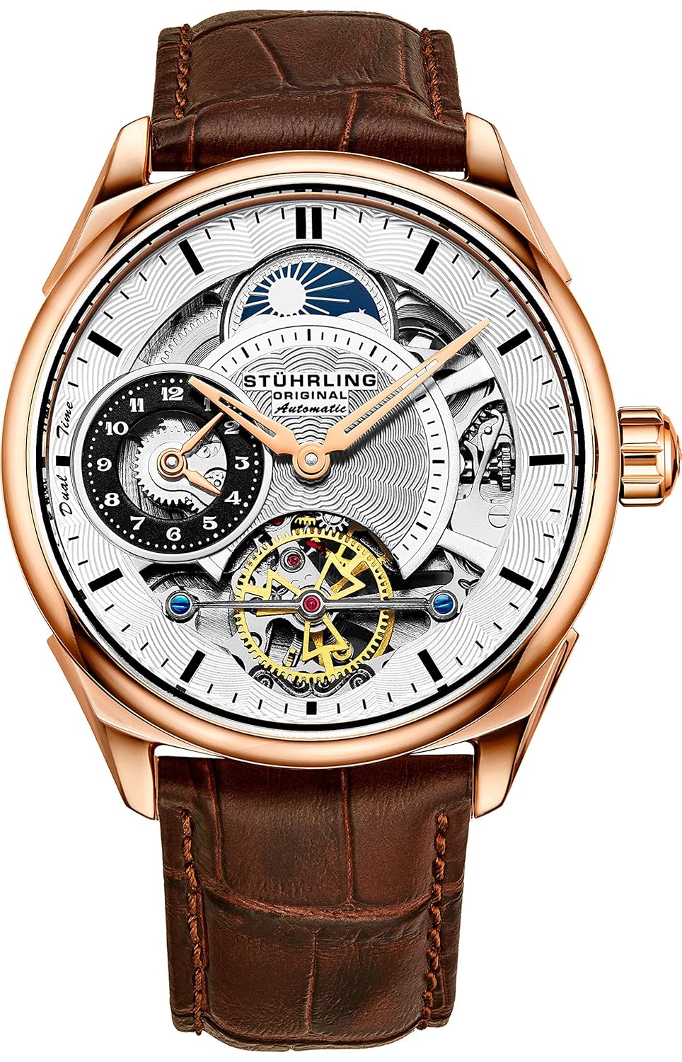 Reign over your domain with the automatic dual-time power of the Presidia 943A. The Stuhrling Original Mens Automatic Dress Watch features a stainless steel case, silver dial with sapphire crystal, and automatic skeleton mechanical movement. It includes a dual time sub-dial, AM/PM indicator, brown leather band, and is water resistant up to 100 meters.