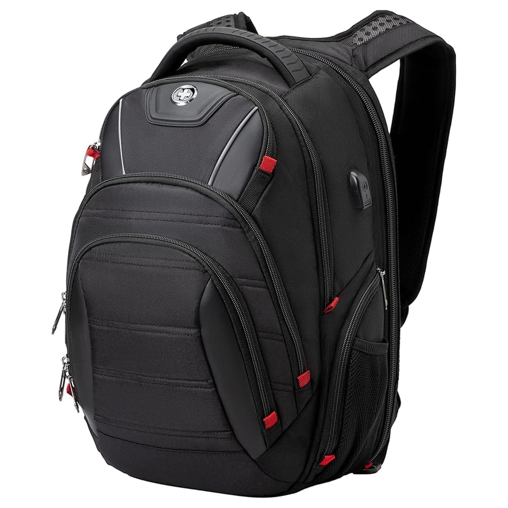 The Swissdigital Design Travel Backpack for men offers TSA-friendly convenience, built-in USB charging, and RFID protection. Designed for business use, it comfortably fits laptops up to 15.6 inches. This black CIRCUIT J14-BR model combines functionality with sleek style for modern travelers.