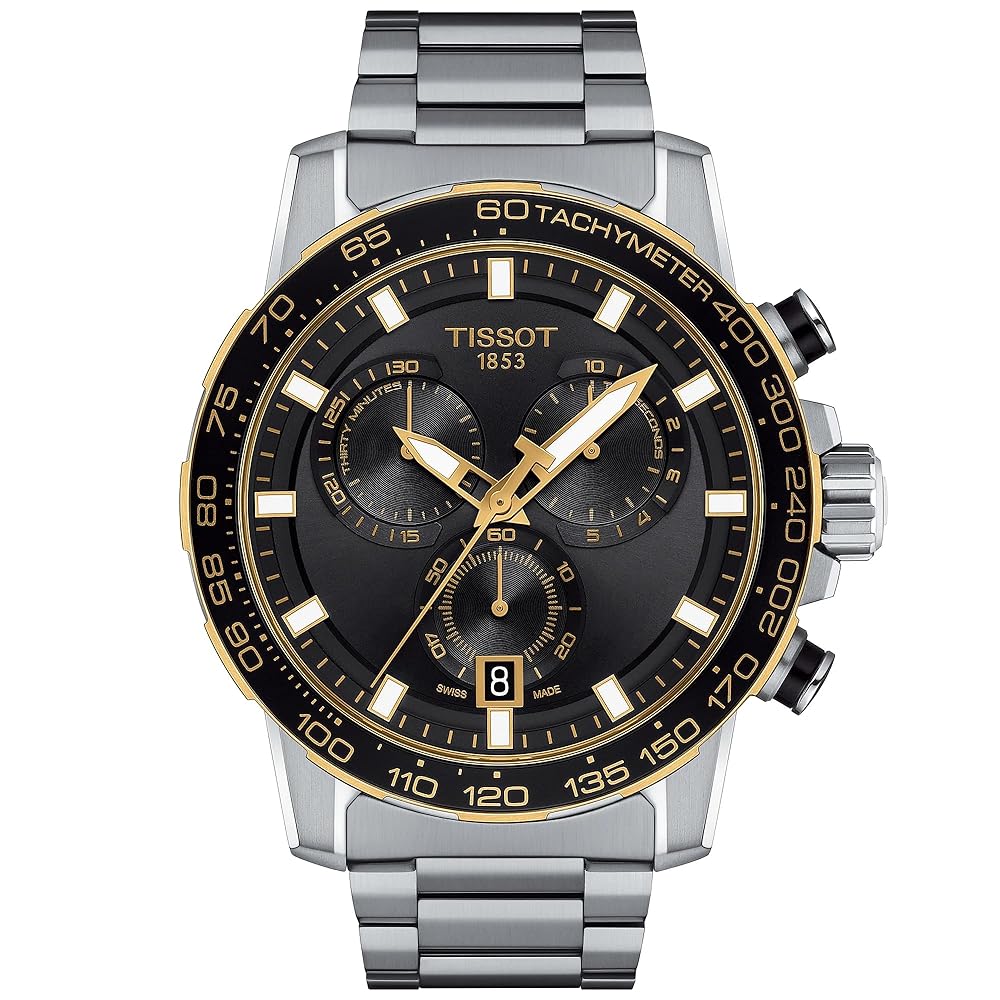 The Tissot men’s Supersport Chrono is a sophisticated stainless steel analog watch featuring a 45.5mm round case, black dial with date display, and tachymeter bezel. It offers Swiss quartz movement, synthetic sapphire crystal, folding clasp with safety, and 330 feet water resistance.