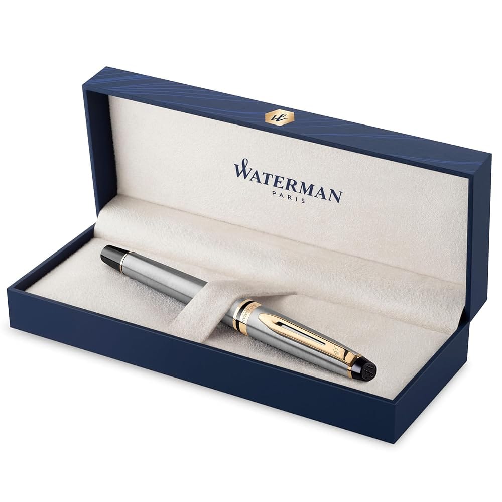The Waterman Expert Fountain Pen features a stainless steel body with elegant 23k gold trim. It includes a medium nib and a blue ink cartridge, packaged in a sophisticated gift box, making it an ideal choice for professionals seeking style and performance.