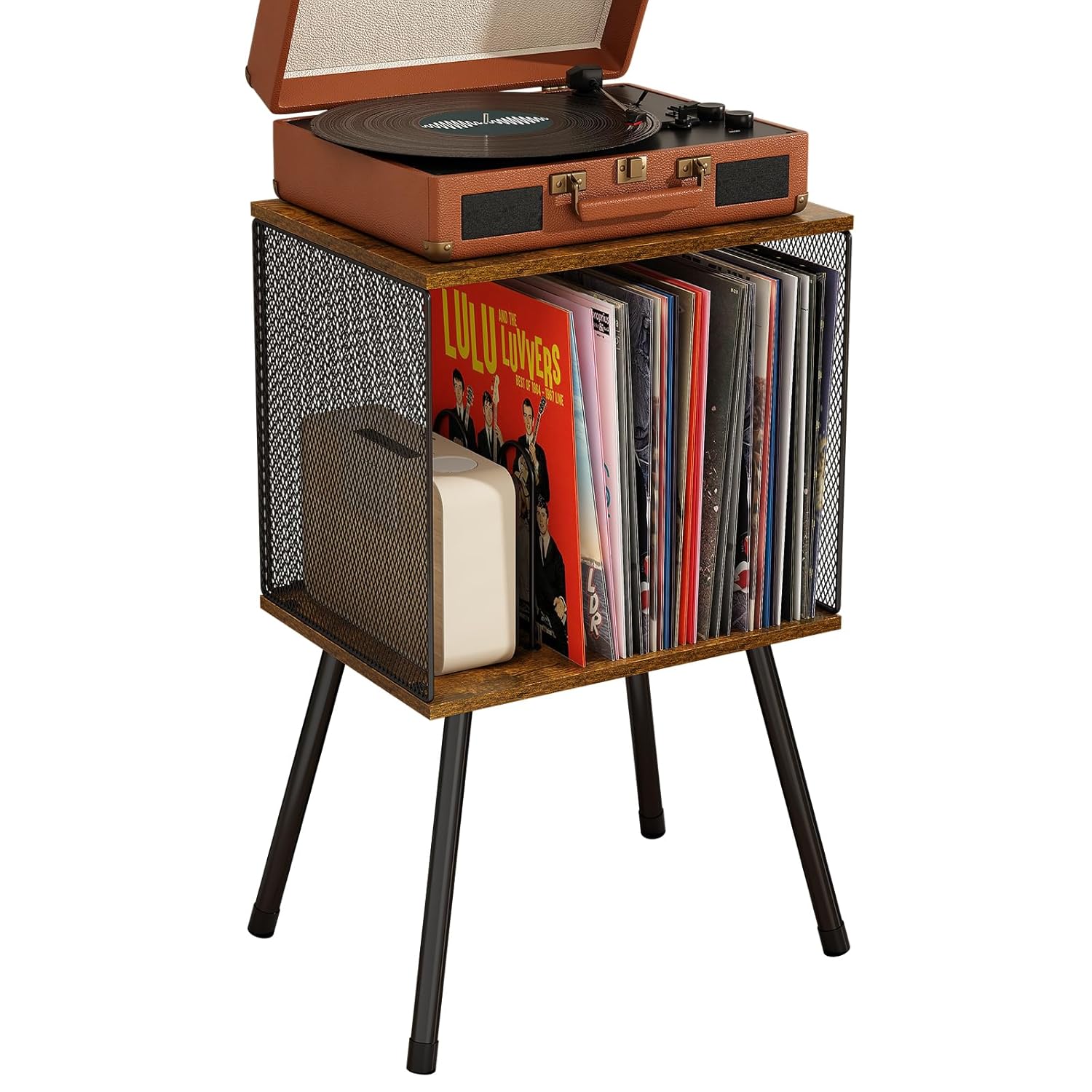 The X-cosrack Record Player Stand combines mid-century style with practical storage, holding up to 100 albums with adjustable dividers for easy organization. Made from durable metal, iron mesh, and MDF, this compact corner shelf offers sturdy tabletop support and effortless assembly, perfect for any indoor space.
